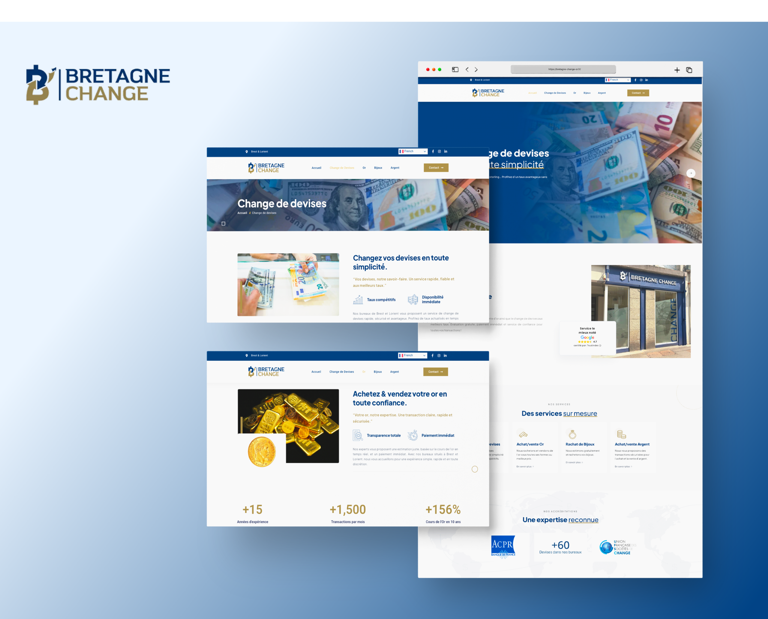 Notre agence Performance Webmarketing a réalisé le site internet de Bretagne Change Or, avec l’objectif de rassurer les internautes et de présenter clairement l’ensemble des services proposés.